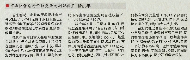 企業的社會責任不僅體現在對企業自身負責任,也要對市場負責任,同時要發揮市場主體作用,強調主體責任,為消費者權益保護做好產品,營造一個好的市場環境,這樣才能贏得消費者的信任,實現雙贏、多贏,共同維護好市場秩序,保護好消費者權益。