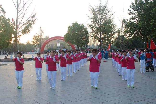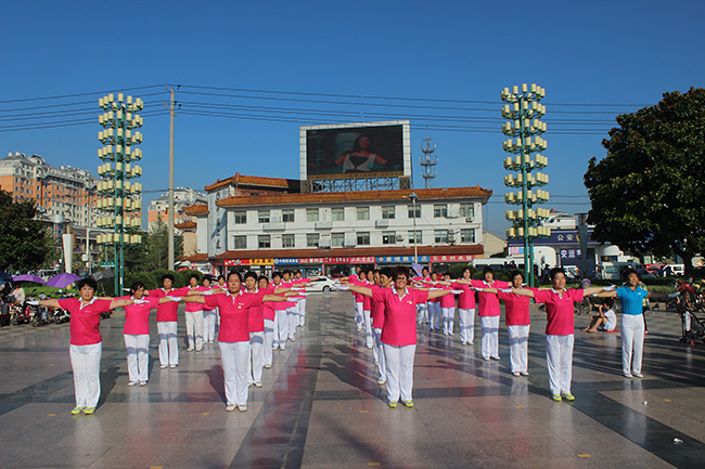 為深入推廣“全民健身”活動,8月12日,江蘇邳州體育局組織廣大健身愛好者舉行了廣場舞表演,近200人組成的康姿百德健身操代表隊深受廣大市民好評。 上午8時,邳州人民廣場上,一群身穿粉紅色T恤衫的人們,精神飽滿,意氣風發,隨著音樂的旋律,富有節奏地伸臂踢腿,提臀扭腰,盡情展現著康姿百德健身操的明快與活力。大家獨具一格的表演,為本次活動構筑了一道亮麗的風景線,引得廣大市民駐足觀賞、一致叫好。