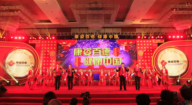 中午1時許,從全國各地趕來參加年會的經銷商蜂擁而至。會場門前,由公司督導師組成的禮儀隊,身著禮服,面帶微笑,列隊歡迎大家的到來,一句句“過年好”、“歡迎您回家”、“您辛苦了”的問候聲不絕于耳。會場內,由公司員工自己搭建的舞臺燈光閃爍,絢麗多彩,懸掛于舞臺兩側的大紅燈籠顯得格外耀眼;舞臺背景的LED屏幕上,“康姿百德、健康中國”、“康姿百德2013-2014年會”等字幕交替顯示;偌大的大廳內,40張餐桌上擺滿了水果、瓜子、花生、飲料……。大家邊吃邊聊,噓寒問暖,徜徉在幸福和愉悅之中,盡情享受著家一般的親切和溫暖。