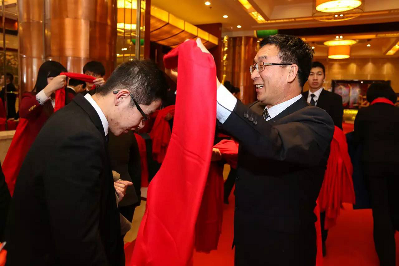 公司領導為所有參加年會的員工和經銷商帶上紅圍巾,送上最真摯的祝福。