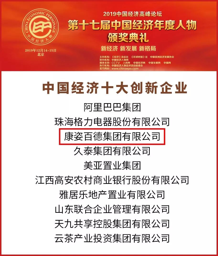2019年12月15日,以“新經濟、新發展、新格局”為主題,由《經濟》雜志社、《環球時報》社、中國亞洲經濟發展協會聯合舉辦的“2019中國經濟高峰論壇暨第十七屆中國經濟人物年會” 在京隆重舉行。康姿百德集團榮獲“中國經濟十大創新企業”榮譽稱號。