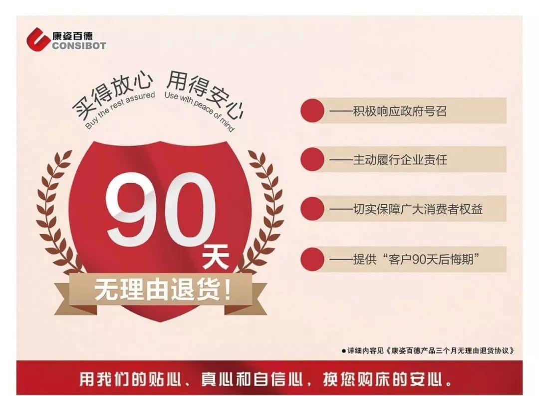 1.三個月無理由退貨,讓康姿百德的產品質量和服務質量,得到了進一步的提高。