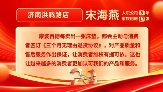 宋海燕表示,因為在康姿百德這樣一個講誠信、負責任的企業工作,讓廣大消費者都更加信任她,這讓宋海燕也非常自豪。她也表示,作為康姿百德的一員,今后,會以更加飽滿的熱情和責任心,全心全意地服務好每一位客戶,讓大家都能感受到她的真心和誠意。