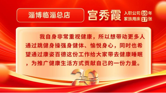 宮秀霞因康姿百德健身操與康姿百德結緣,入職后,了解到康姿百德是一家有社會責任感的公司,一直用實際行動推動著“健康中國”建設。