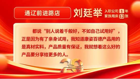 劉廷舉還說:“感謝康姿百德,讓我在這里收獲了很多親人,讓我們感受到了很多溫暖,這也讓我干著很有底氣。尤其是將這么好的產品介紹給親朋好友使用后,也讓我們的親情和友情更加濃厚了。現在,我的家人都很支持我的工作。家人們不光認可公司,還認可康姿百德的產品,目前我的家族已經使用12張康姿百德床墊了。家人的支持和鼓勵,是我最堅實的后盾,我也有信心,在康姿百德創造更大的價值。”
