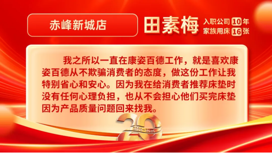 田素梅還說道:“我之所以一直在康姿百德工作,就是喜歡康姿百德從不欺騙消費者的態度,做這份工作讓我特別省心和安心。因為我在給消費者推薦床墊時沒有任何心理負擔,也從不會擔心他們買完床墊因為產品質量問題回來找我。今年是康姿百德成立20周年,我覺得公司能夠發展的越來越好、越來越壯大,離不開認真做產品,真誠對待消費者。希望我能在這么好的公司一直干到退休。”