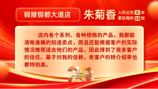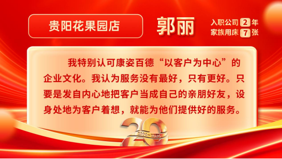 今年是康姿百德集團成立20周年。在20年的發展歷程中,有這樣一群人,他們在市場經營管理過程中,深刻貫徹以客戶為中心的理念,始終把優質的服務融于門店經營的每個環節,也因此得到了客戶的贊賞和認可。他們就是康姿百德專賣店的員工。本期和您分享的是康姿百德貴州地區和安徽地區專賣店員工代表的故事。