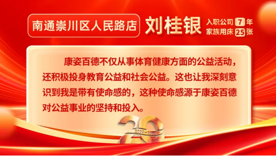 劉桂銀表示,我加入康姿百德已經有7年的時間了,受益于康姿百德健身操,既鍛煉了身體,還結識了很多熱愛運動的朋友。作為一名健身愛好者,我非常幸運能夠加入到康姿百德這個大家庭,通過向身邊的人傳播健康,讓更多的人享受健康人生,這讓我覺得非常有成就感。現在公益也早已成為我生活的一部分。今后,我會繼續響應康姿百德集團的號召,把“科學健身、健康生活”的觀念傳遞給更多的人,也會身體力行地幫助更多需要幫助的人。