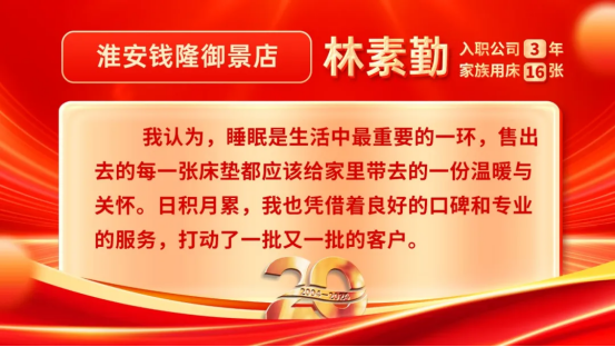 作為康姿百德專賣店的店員,林素勤常常掛在嘴邊的一句話就是“在崗一分鐘,敬業60秒”。每一分、每一秒都要創造價值。她的這份敬業不僅表現在不溜崗、不空崗,不忙的時候她還會花心思布置展區、學習產品知識,以最充足的準備迎接客戶。她一直認為,成交不是銷售的終止,在征集客戶同意的前提下,她會做不定期的售后追蹤,及時解決客戶在使用中遇到的問題,并給予正確指導。她認為,睡眠是生活中最重要的一環,售出去的每一張床墊都應該給家里帶去的一份溫暖與關懷。日積月累,林素勤用她良好的口碑和專業的服務,打動了一批又一批的客戶。