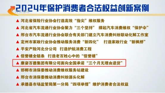 節目中,河北省消費者權益保護委員會秘書長王守用現場宣布了2024年保護消費者合法權益創新案例。康姿百德集團有限公司面向全國承諾“三個月無理由退貨”,成功入選。