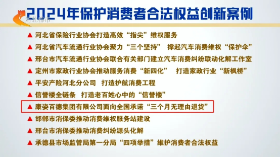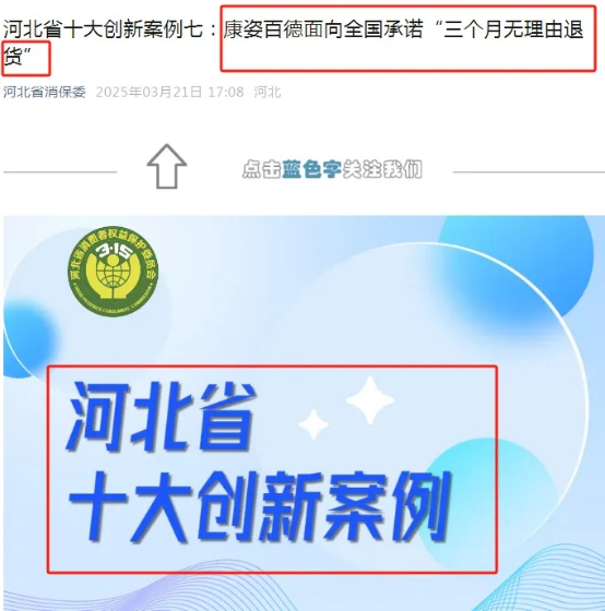 河北省消費者權益保護委員會還在其官方微信公眾號上,對康姿百德入選“河北省十大創新案例”進行了專題推送,將“三個月無理由退貨”作為典范向社會公開推廣。()