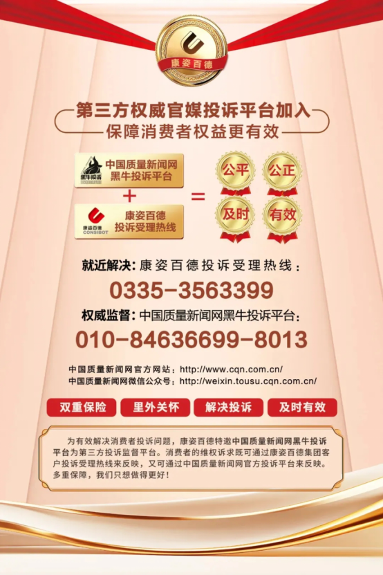 為了進一步提升專賣店的服務水平,更好地保護消費者的合法權益,康姿百德開通企業投訴受理熱線,加入了中國消費者協會“智慧315”消費維權投訴平臺,還特邀“中國質量新聞網黑牛投訴平臺”作為第三方投訴監督平臺。并且,統一制作監督舉報公示牌張貼在全國所有門店,主動接受消費者的監督。多重途徑保障消費者的合法權益,真正做到投訴有渠道,事事有回音,件件有著落,讓廣大消費者購買無憂。