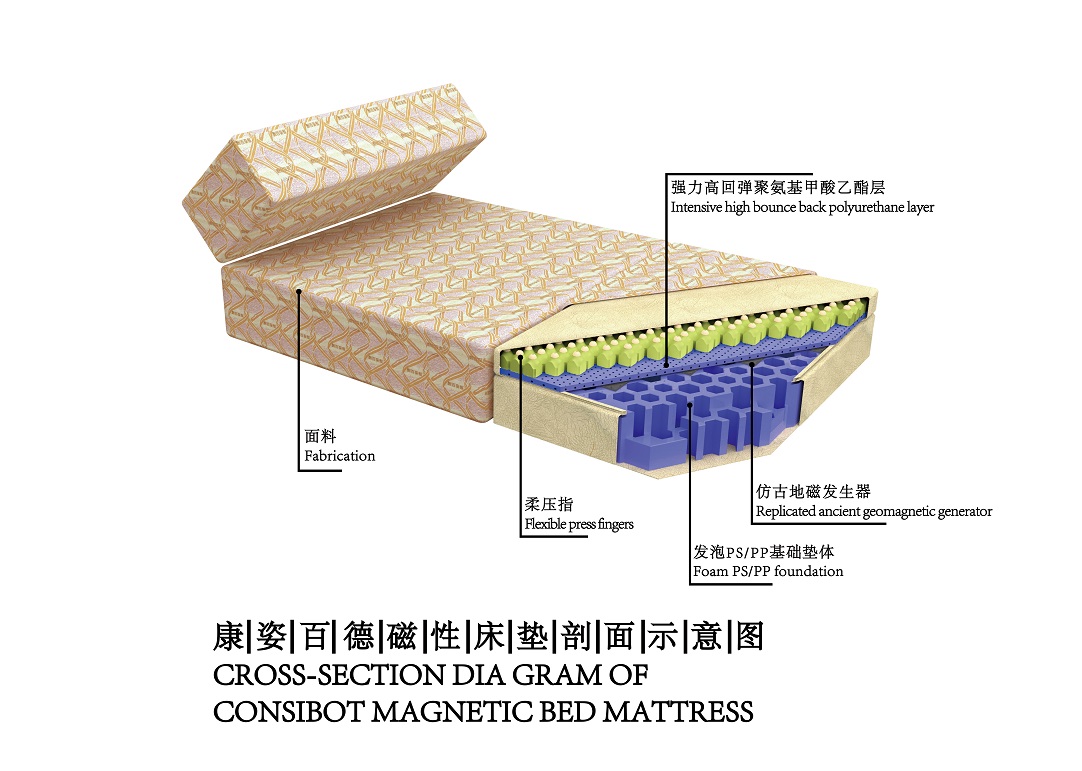 該系統為康姿百德磁性床墊(dian)內置(zhi)核心技(ji)術(shu)之二,由柔壓(ya)指(zhi)層、強力高(gao)回(hui)彈聚氨基甲(jia)酸乙酯層、發(fa)泡PS/PP基礎墊(dian)體(ti)(ti)(ti)等多(duo)個部(bu)分(fen)組成,有以下(xia)(xia)特點: 1、靜態被動指(zhi)壓(ya):由多(duo)種高(gao)分(fen)子材料經特殊工藝處理而成的(de)(de)乳突狀(zhuang)凸(tu)起(qi),可在靜態狀(zhuang)態下(xia)(xia)對(dui)人體(ti)(ti)(ti)產生被動指(zhi)壓(ya)的(de)(de)作用(yong)(yong)。 2、自(zi)(zi)然通(tong)風透(tou)氣:墊(dian)體(ti)(ti)(ti)采(cai)用(yong)(yong)模具成型的(de)(de)乳突狀(zhuang)凸(tu)起(qi)結構(gou)和蜂窩狀(zhuang)自(zi)(zi)然通(tong)氣孔道設計,保(bao)持床體(ti)(ti)(ti)干(gan)爽舒(shu)(shu)適(shi)。 3、符合人體(ti)(ti)(ti)工效學原理:無簧彈性支(zhi)撐系統墊(dian)體(ti)(ti)(ti)能順應(ying)人體(ti)(ti)(ti)自(zi)(zi)然生理曲線,腰部(bu)得到承(cheng)托,臀部(bu)適(shi)度下(xia)(xia)陷,脊椎保(bao)持正常的(de)(de)生理彎(wan)曲,使身體(ti)(ti)(ti)各部(bu)位處于放松(song)狀(zhuang)態,獲得健康舒(shu)(shu)適(shi)的(de)(de)睡眠體(ti)(ti)(ti)驗。