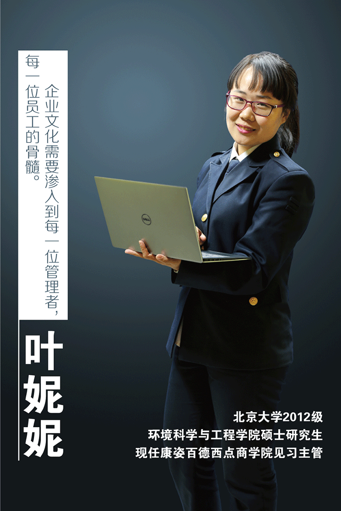 葉妮妮,北京大學2012級環境科學與工程學院碩士研究生,現任康姿百德西點商學院見習主管。