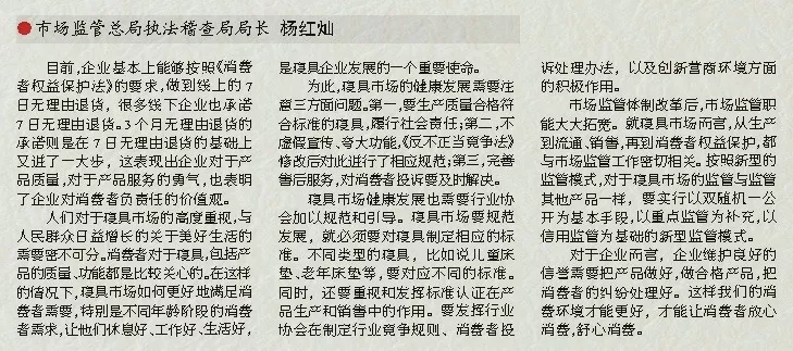 為此,寢具市場的健康發展需要注意三方面問題。第一,要生產質量合格符合標準的寢具,履行社會責任;第二,不虛假宣傳、夸大功能,《反不正當競爭法》修改后對此進行了相應規范;第三,完善售后服務,對消費者投訴要及時解決。