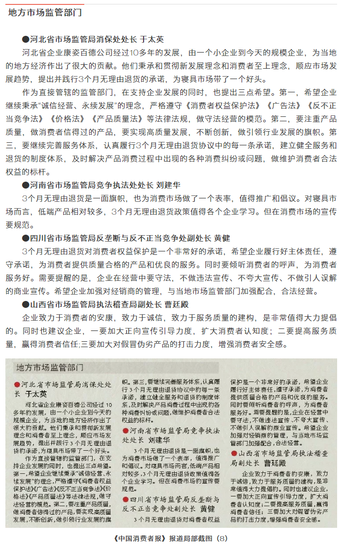 中國消費者報訊 為(wei)構建(jian)良(liang)好的消(xiao)費(fei)環境,規范寢具(ju)市(shi)場(chang)(chang)秩序,推動寢具(ju)行業(ye)自律和(he)健康發展(zhan),由中國消(xiao)費(fei)者(zhe)報社主辦、康姿百(bai)德(de)集團有限(xian)公司協(xie)辦的“寢具(ju)市(shi)場(chang)(chang)秩序與消(xiao)費(fei)者(zhe)權(quan)益保護”座談(tan)會(hui)(hui)于2019年(nian)5月28日在北京召開,來自國家(jia)市(shi)場(chang)(chang)監督管理(li)總局相關(guan)司局、中國企(qi)業(ye)家(jia)協(xie)會(hui)(hui)的相關(guan)領導(dao)、專(zhuan)家(jia)及寢具(ju)知名企(qi)業(ye)代表(biao),圍繞消(xiao)費(fei)者(zhe)權(quan)益保護、促進寢具(ju)市(shi)場(chang)(chang)良(liang)性競爭與規范發展(zhan)等話(hua)題進行了(le)深入探討。本次(ci)座談(tan)會(hui)(hui)上,與會(hui)(hui)代表(biao)共同(tong)見(jian)證了(le)康姿百(bai)德(de)公司承諾(nuo)“3個月無理(li)由退貨”啟動儀式。